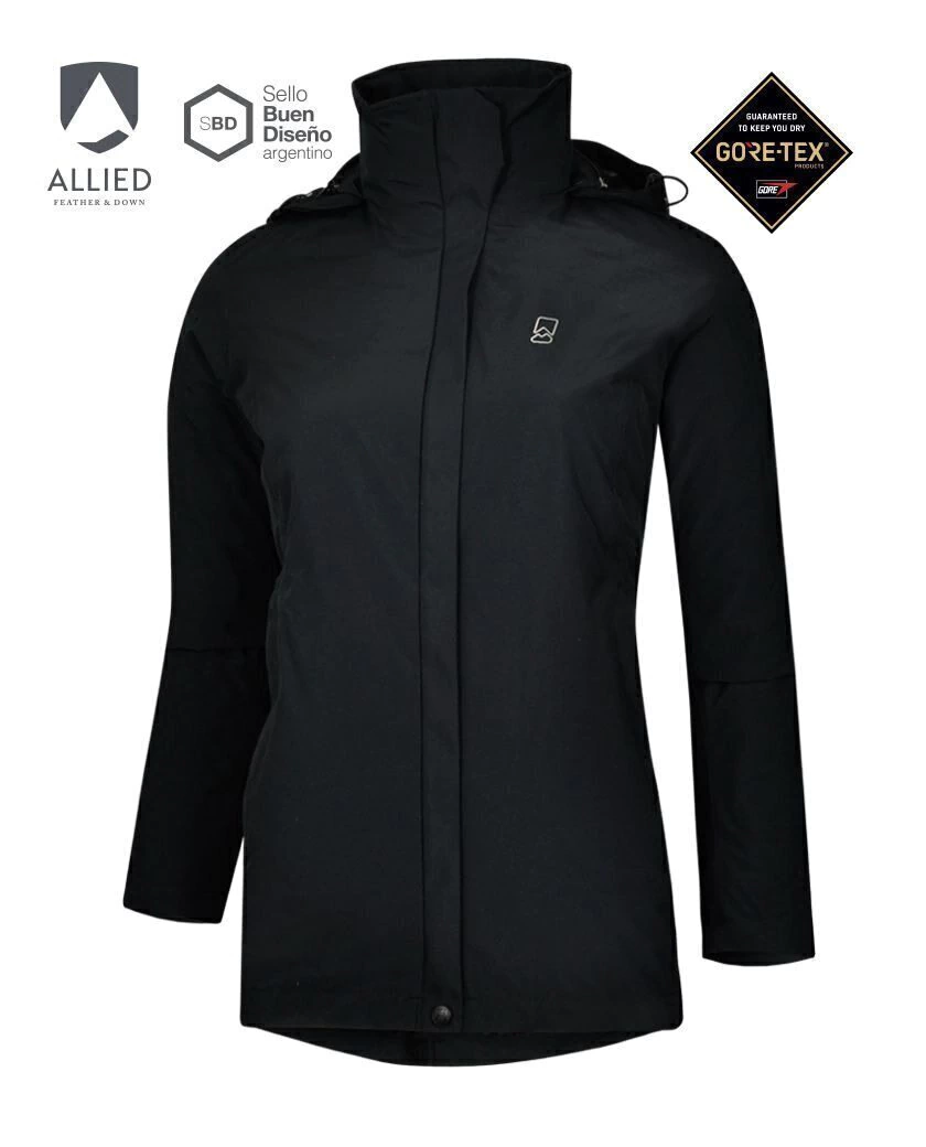 Dos prendas en una, con tres combinaciones posibles que le permiten adaptarse a diversas condiciones climáticas. La prenda exterior es de GORE-TEX 100% Impermeable y respirable. La interior es de plumón ALLIED Fill Power 800, gran capacidad de abrigo.