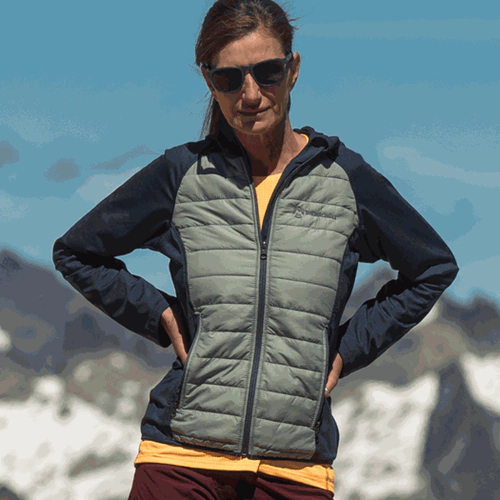 Es una prenda con un concepto hibrido, combinando dos materiales. La combinación de tejidos en la prenda ayuda a garantizar tanto abrigo como libertad de movimiento. Ofreciendo aislación y transpirabilidad.
