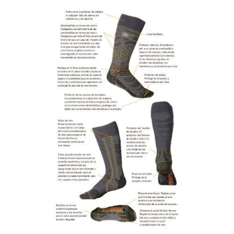 Medias con tecnologia de proteccion reforzada para incrementar al maximo el rendimiento del usuario y ofrecer ultra proteccion a los musculos del pie. Realizadas con tejidos inteligentes, fibras especiales, sectores de almohadillas y canales de aire entre otras caracteristicas.