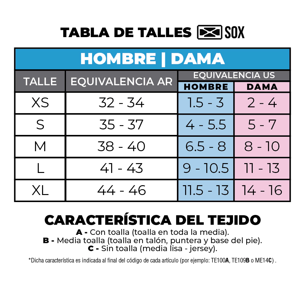 Puño doble y caña elastizados, pie con media toalla, empeine elastizado, remallado plano, talon y puntera reforzados. Ajuste y calce perfecto gracias al agregado de spandex. Tejidas con hilado de microfibra que tiene como propiedad expulsar la humedad del pie hacia y mantenerlo seco.
