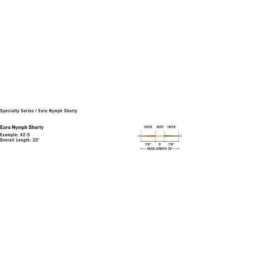 RIO S EURO NYMPH SHORTY es una línea de moscas ultra delgada y super sensible diseñada para la ninfa europea. La línea se hace deliberadamente corta (6,1 metros) para que se pueda agregar al extremo delantero de una línea de flote regular utilizando el lazo delgado soldado en cada extremo. La idea es que los pescadores puedan utilizar su estilo normal de pesca con mosca con su línea de trucha habitual, y cuando llegan a una corredera y quieren pescar al estilo ninfa europea, simplemente colocan el Shorty y comienzan a ninfear. Rápido, fácil y sin necesidad de caña o reel extra.