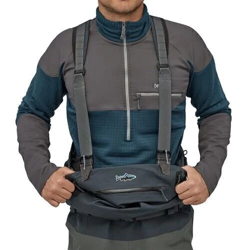 El sistema de suspensión de liberación rápida totalmente ajustable permite la conversión de la altura del pecho a la cintura, cincha con cordón en el dobladillo superior, cinturón de vadeo seguro, elástico y sin enganches